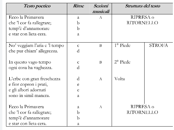 Indicando con A la ripresa, cantata d’apprima dal solista e subito riproposta dal coro, che la ripete dopo ogni stanza, con B il primo piede e con B1 il secondo piede, con C la volta ( BB1 e C sono le parti di cui si compone la strofa che canta il solista) si nota che i piedi rimano sempre tra loro ( rima alternata) e che la volta rima sempre con l’ultimo verso della ripresa e l’ultimo verso del piede.