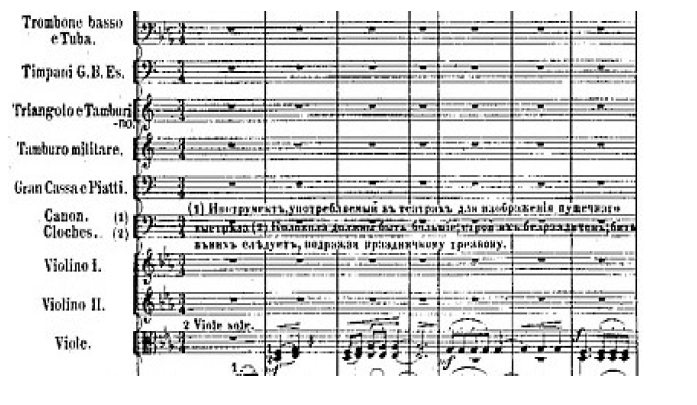 Nell’Overture 1812 op. 49 poema sinfonico del 1880 di P. I. Tchaicovskij compaiono colpi di cannone e rintocchi di campane. Si potrebbe considerarli corpi estranei al contesto musicale e quindi per un certo verso una sorta di oggetti sonori a sé stante , ma mancano della caratteristica fondamentale che qualifica l’oggetto sonoro : l’interesse per il suono ( l’elemento ) in sé e non per quello che rappresenta o significa e qui Tchaicovskij parla della tentata invasione delle truppe napoleoniche in Russia, quale miglior servizio potrebbero rendere quei cannoni o quelle campane?